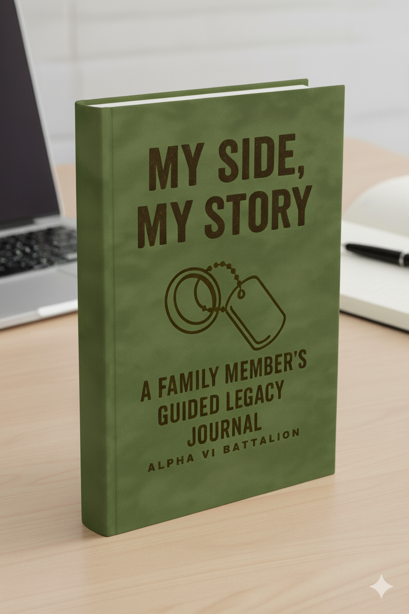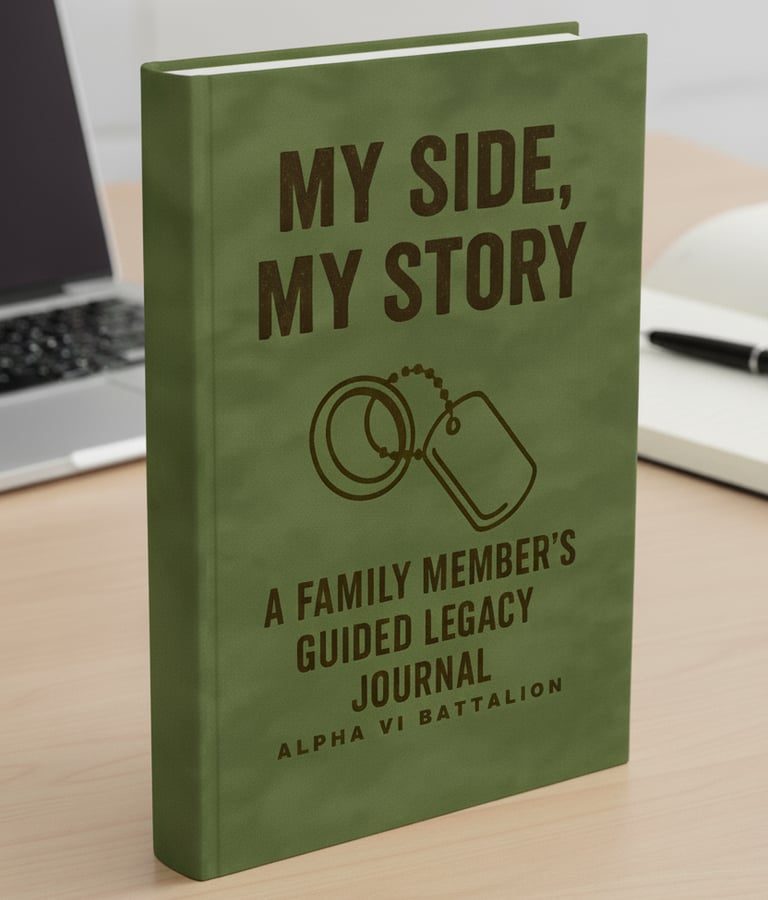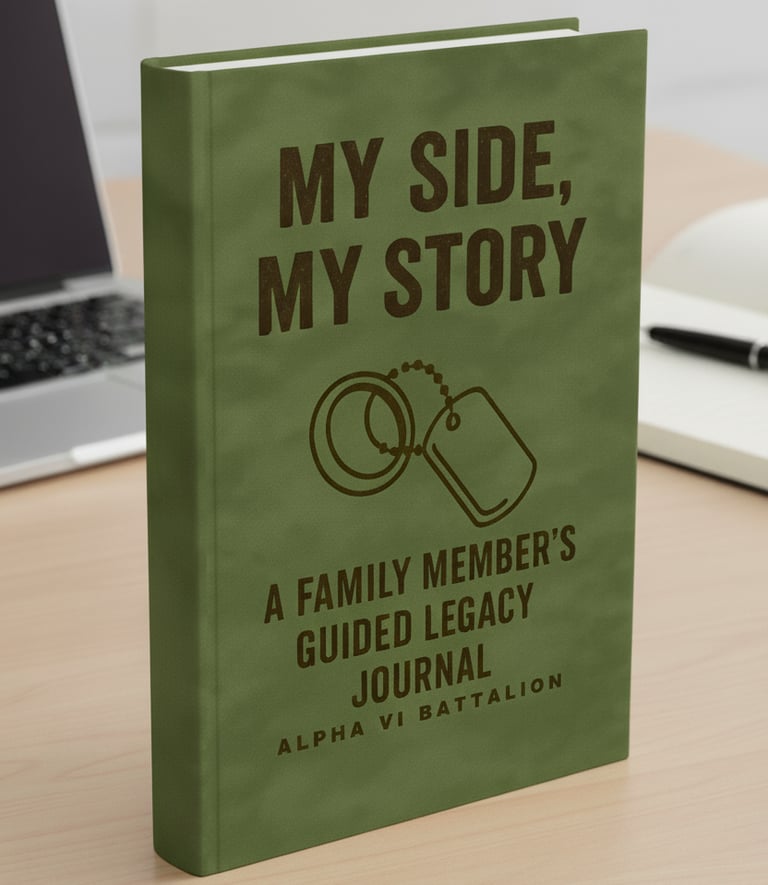 My Side, My Story gives military families the chance to share their perspective of life in service. With guided prompts tailored for spouses, children, and loved ones, this journal helps capture the resilience, sacrifices, and support systems that often go untold. From holding down the home front to celebrating milestones apart, every page honors the family’s story as part of the veteran’s journey. It’s not just a journal—it’s a tribute to the strength and love of military families.